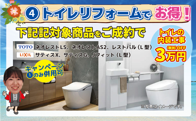 下記対象トイレをご成約でトイレの内装工事3万円(税別)OFF