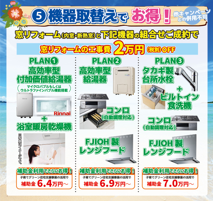 窓リフォーム(内窓、断熱窓)、キッチン、お風呂、トイレ、高効率型付加価値給湯器(マイクロバブルもしくはウルトラファインバブル機能搭載)、浴室暖房乾燥機、自動調理対応のコンロ、節電効果のあるレンジフード、ビルトイン食洗機、台所水栓など、お住まいのグレードアップに幅広くご活用いただけるキャンペーンです