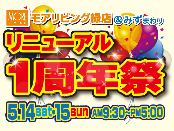 1周年を記念いたしまして「リニューアル1周年祭」をモアリビング緑店&みずまわりにて開催いたします!!