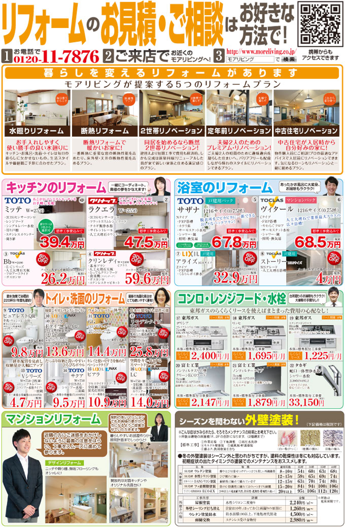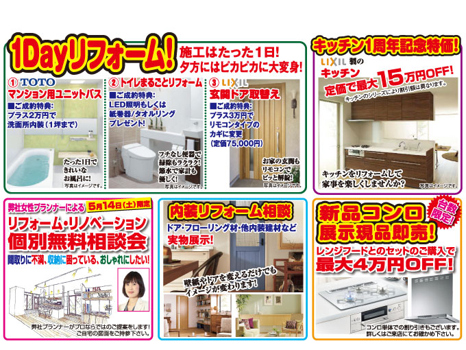 2日間限定でLIXIL製キッチンが定価より15万円OFFになったり、TOTOのトイレまるごとリフォームでLED照明もしくは紙巻器/タオルリングをプレゼントなど、おトクな情報や企画が満載です!