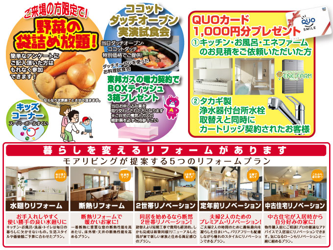 他にもご来場の方限定で、野菜の袋詰め放題!や「キッチン/お風呂/エネファームのお見積をご依頼いただいた方」もしくは「タカギ製浄水機付台所水栓取替えと同時にカートリッジ契約された方」には、クオカード1,000円分をプレゼント! 、「東邦ガスの電力契約でBOXティッシュ3箱プレゼント!」など、ご来場された方ほどお得になるイベントとなっています。 皆さま是非ともお気軽にお立ち寄りください!