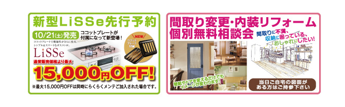 イベント開催中は混雑が予想されます。リノベーション・リフォームのご相談を個別にゆっくりとしたい方は、ご来店予約にて承っておりますので、そちらよりご予約をお願いいたします。