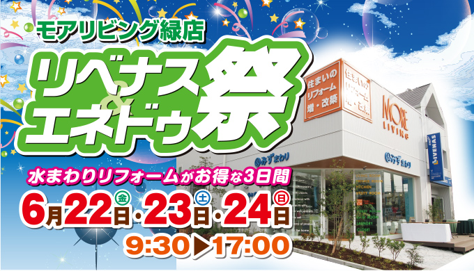 今年も水まわりリフォームやガス機器購入がお得になるリベナスエネドゥ祭をモアリビング緑店にて開催します。