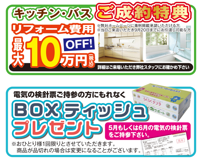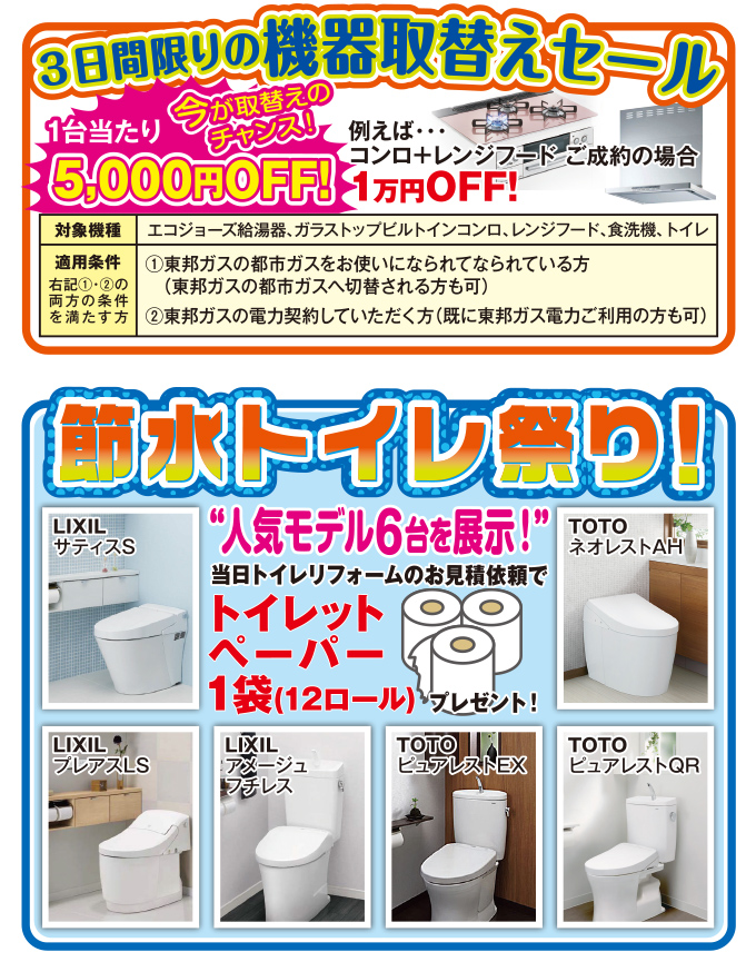 ガスコンロ・レンジフード・給湯器・食洗機・水栓・トイレ・キッチン・バスなどのリフォームをお考えの方はぜひこの機会をお見逃しなく。