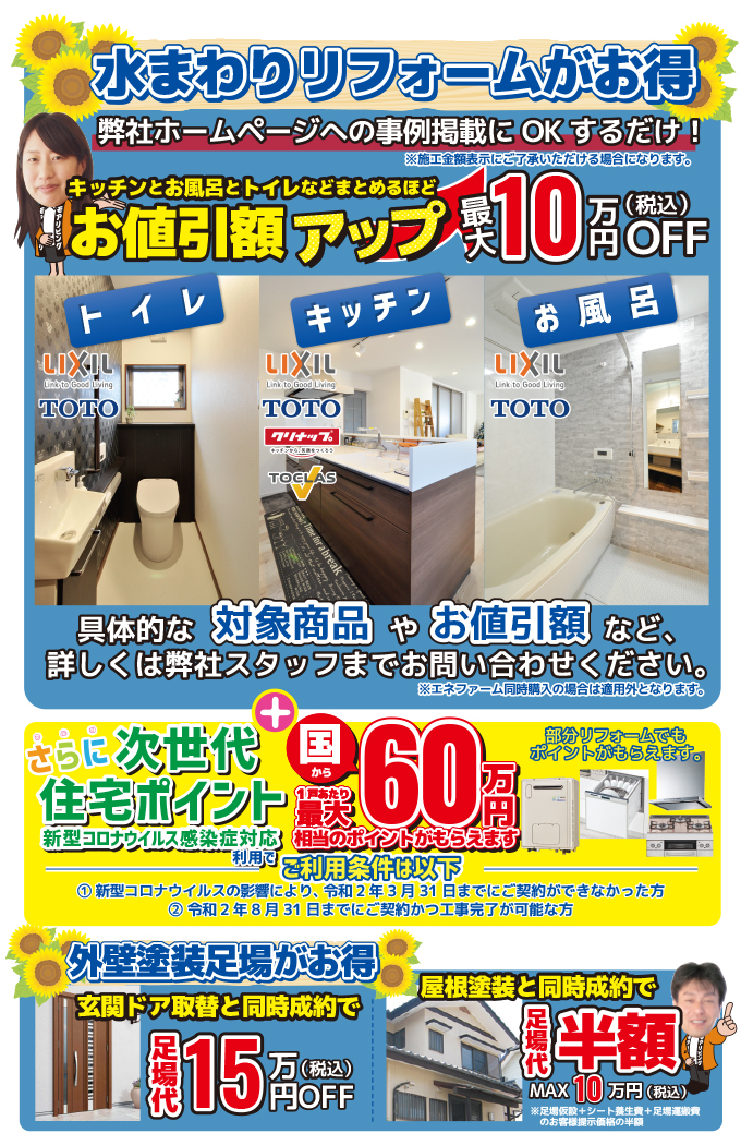 水まわり設備のリフォーム、外壁・屋根塗装など、お住まいのグレードアップに幅広くご活用いただけるキャンペーンです。8月31日までにご契約かつ工事完了いただける方は、次世代住宅ポイント(新型コロナウイルス感染症対応)も利用すれば、Wでお得にリフォーム可能です。