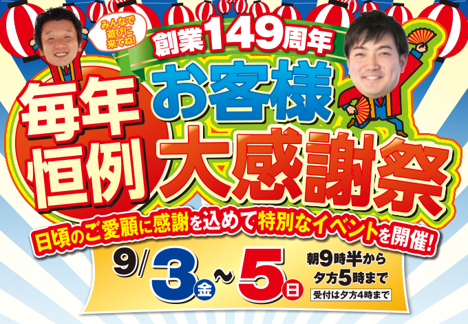 (緑店)創業149周年、お客様大感謝祭を自店舗にて開催!(2021年9月3日〜5日)