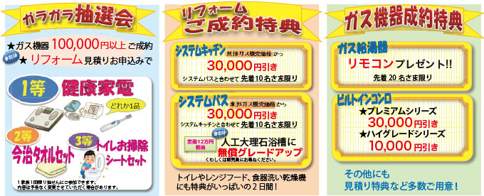 他にもガラガラ抽せん会やリフォームご成約特典、ガス機器成約特典、さらに、エネファームのお見積り実施でクオカード2,000円分プレゼントなど、豪華な特典が目白押しとなっております。