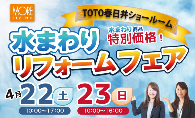 4月の22日(土)23日(日)はTOTO春日井ショールームにて『水まわりリフォームフェア』を開催いたします。