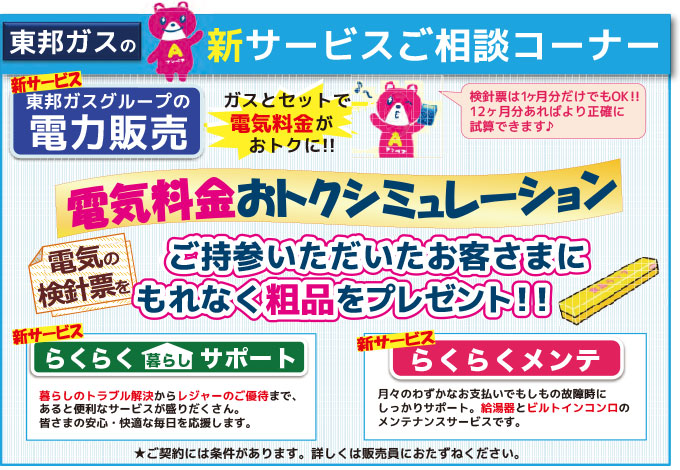 同時に「新サービスご相談コーナー」も併設していますので、新しく始まった電力販売のことや、らくらく暮らしサポート・らくらくメンテなどのサービスについても詳しくお聞きいただけます。電気料金をまとめていくらおトクになるのかをシュミレーションすることも可能です^^