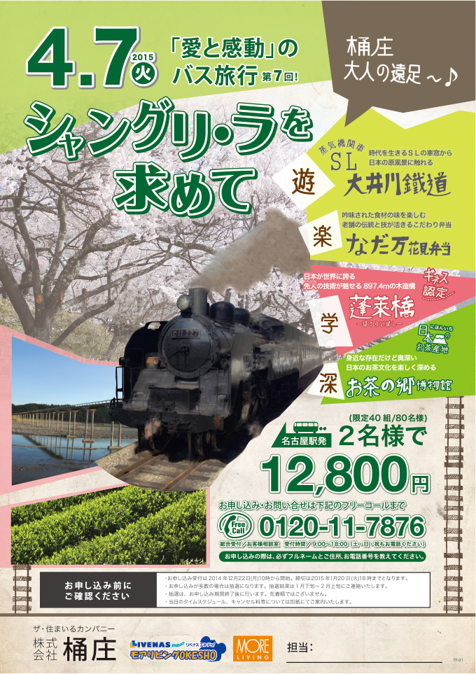 イベント 第7回「愛と感動」のバス旅行 シャングリ・ラを求めて!! 今年も開催します! 静岡県島田市金谷 このイベントは終了しました。 たくさんのご来場、ありがとうございました! 企画から運営まですべて桶庄がプロデュースする大人の遠足。 「愛と感動」のバス旅行を今年も開催します! 今年は静岡県の大井川鐵道のSLを中心に心に染みる桜旅へとご案内いたします。 どうぞお楽しみに♪ ↓↓↓詳しくはイベントチラシをチェック アクセス 静岡県島田市金谷 Google マップでみる このイベントは終了しました。 たくさんのご来場、ありがとうございました!