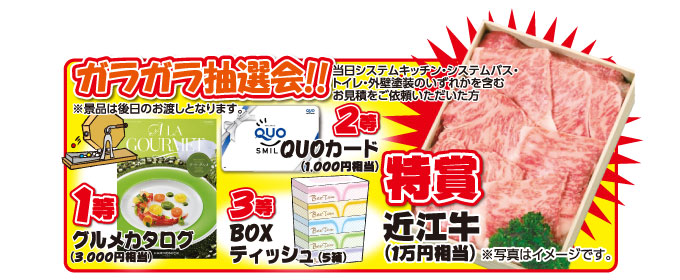 当日は、システムキッチン or システムバス or トイレ or 外壁塗装を含む工事の見積をご依頼いただくと、特賞近江牛が当たる「ガラガラ抽選会」へとご参加頂けます!