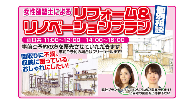また、弊社のプランナー(建築士資格あり)が個別にプランニングについて相談を受け付けます!間取りの不満から収納のお困り事、なんとなくおしゃれにしたい!などどんな小さな疑問でもOK!!