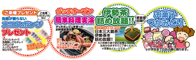 他にも「ご来場プレゼント」や「ダッチオーブン簡単料理実演」、「伊勢茶の詰め放題」、お子さまには「お菓子の詰め放題」など、ご来場するだけでもとってもお得なイベントとなっています。