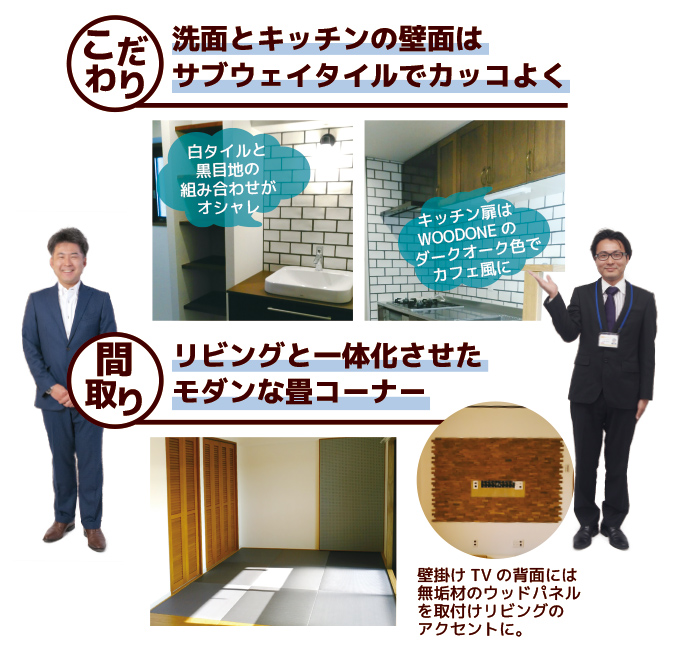 凹凸のあるブラックウォールナットのウッドパネルを、壁掛けTVの壁面に設置(無垢材のぬくもりと表情があり、リビングのアクセントに) / 和室をリビングダイニングと一体化させたモダンな畳コーナー(4.5帖の畳コーナーは、スタイリッシュなブルーバイオレット色の半畳)(グレーに塗装した有効ボードは飾りながらハンギング収納を楽しむ今人気のアイテム)(リゾートライクな雰囲気の天然木のルーバー建具は湿気がこもりにくいデザイン) / キッチンと洗面の壁面には、木目×黒目地のサブウェイタイルでカッコよく(キッチンは扉が美しいWOODONEのダークオーク色)