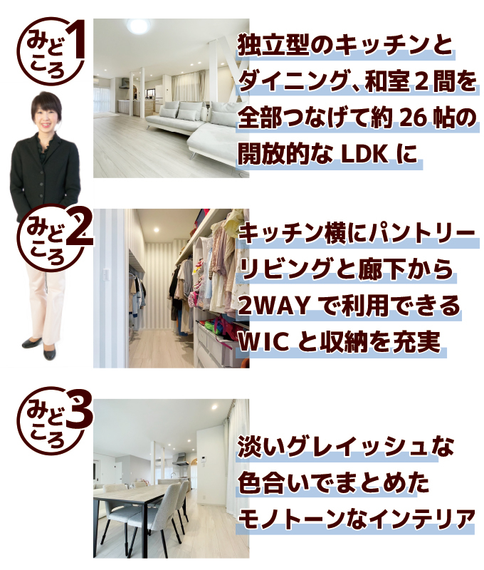 和室2間と独立型のキッチンダイニング→広い1間のLDK+フリースペースとし、開放感がありコミュニケーションの取りやすい間取りに。 / キッチン横にパントリー、リビングと廊下から2WAYで利用できるW.I.Cを設け、収納を充実。 / 共働きご夫婦で、家事楽/掃除楽/時短アイテムを基準に採用(食洗機、レンジフード、水栓、照明、幹太くんetc)。 / 淡いグレイッシュな色合いでまとめたモノトーンなインテリア。