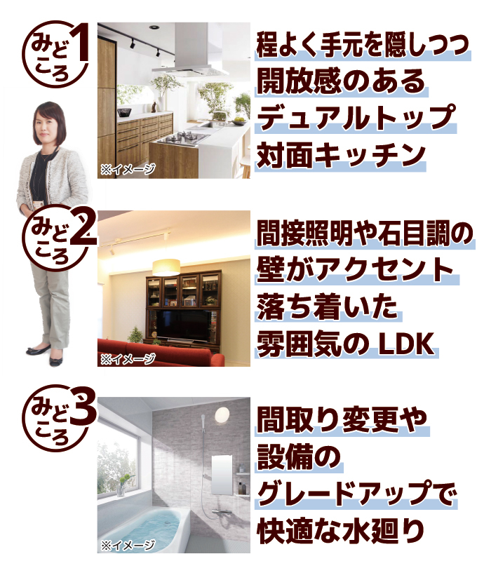 開放感のあるデュアルトップ対面キッチン / 天井が高く、広々としたLDK / こだわりの水廻り設備で清掃性、デザイン性がアップ(ユニットバス:TOTO/サザナ、洗面:TOTO/オクターブ、トイレ:TOTO/レストパル)