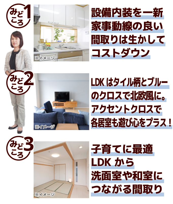 設備内装を一新。家事動線の良い間取りは生かしてコストダウン / LDKはタイル柄とブルーのクロスで北欧風に。アクセントクロスで各居室も遊び心をプラス! / 子育てに最適。LDKから洗面室や和室につながる間取り