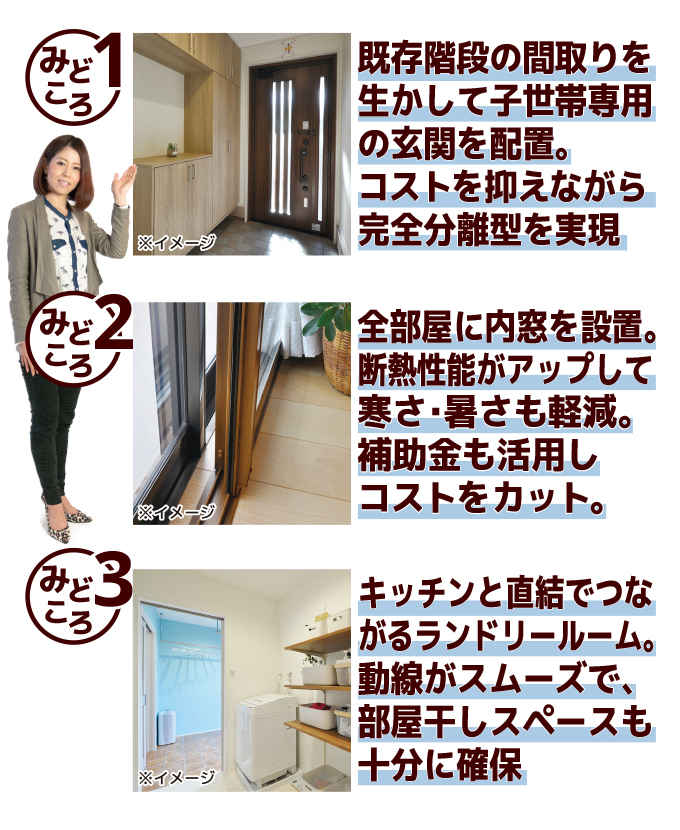 ①既存階段の間取りを生かして子世帯専用の玄関を配置。コストを抑えながら完全分離型を実現、 ②全部屋に内窓を設置。断熱性能がアップして寒さ・暑さも軽減。補助金も活用しコストをカット、 ③キッチンと直結でつながるランドリールーム。動線がスムーズで、部屋干しスペースも十分に確保