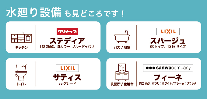 ①クリナップ/ステディア:I型 2550、扉カラー:ブルードゥパリ、 ②LIXIL/スパージュ:BXタイプ、1316サイズ、 ③LIXIL/サティス:S5グレード、 ④sanwacompany/フィーネ:間口750、ボウル:ホワイト/フレーム:ブラック