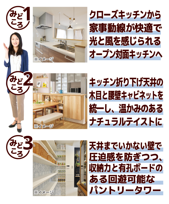 ①クローズキッチンから家事動線が快適で光と風を感じられるオープン対面キッチンへ、 ②キッチン折り下げ天井の木目と腰壁キャビネットを統一し、温かみのあるナチュラルテイストに、 ③天井までいかない壁で圧迫感を防ぎつつ、収納力と有孔ボードのある回遊可能なパントリータワー