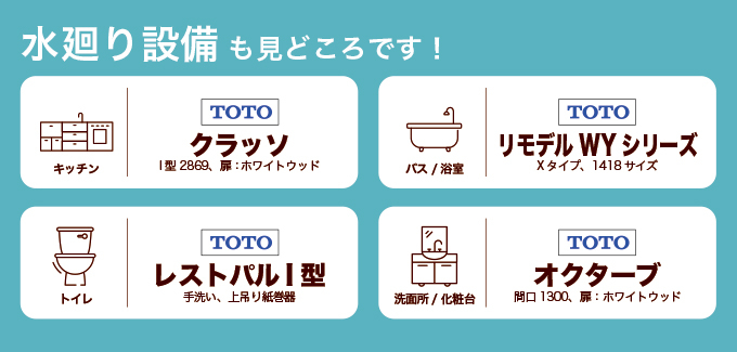①TOTO/クラッソ:I型 2869、扉:ホワイトウッド、 ②TOTO/リモデルWYシリーズ:Xタイプ、1418サイズ、 ③TOTO/レストパルI型:手洗い、上吊り紙巻器、 ④TOTO/オクターブ:間口1300、扉:ホワイトウッド