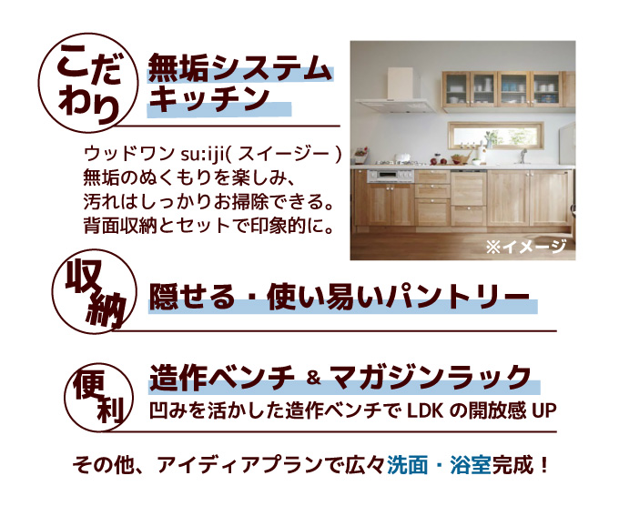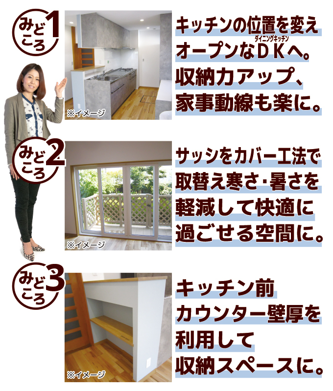 ①キッチンの位置を変えオープンなダイニングキッチンへ。収納力アップ、家事動線も楽に、 ②サッシをカバー工法で取替え寒さ・暑さを軽減して快適に過ごせる空間に、 ③キッチン前カウンター壁厚を利用して収納スペースに