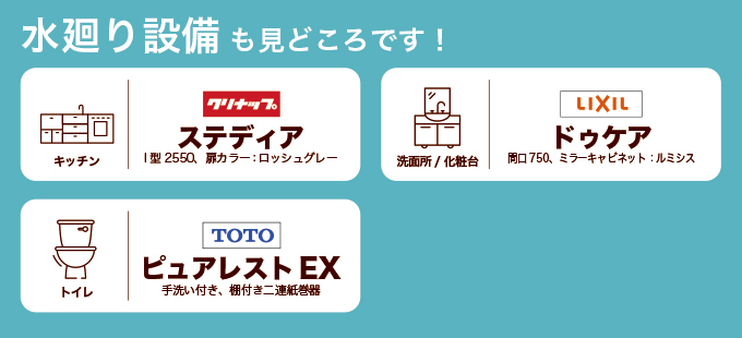 ①クリナップ/ステディア:I型 2550、扉:ロッシュグレー、 ②TOTO/ピュアレストEX:手洗い付き、棚付き二連紙巻器、 ③LIXIL/ドゥケア:間口750、ミラーキャビネット:ルミシス