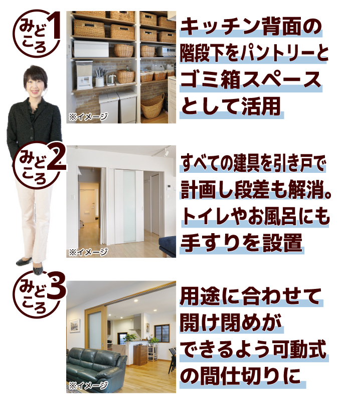 ①キッチン背面の階段下をパントリーとゴミ箱スペースとして活用。 ②すべての建具を引き戸で計画し段差も解消。トイレやお風呂にも手すりを設置。 ③用途に合わせて開け閉めができるよう可動式の間仕切りに。