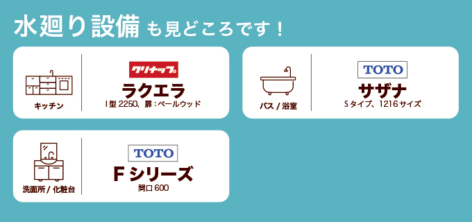 ①クリナップ/ラクエラ:I型 2250、扉:ペールウッド ②TOTO/サザナ: Sタイプ、1216サイズ ③TOTO/Fシリーズ:間口600