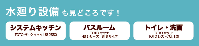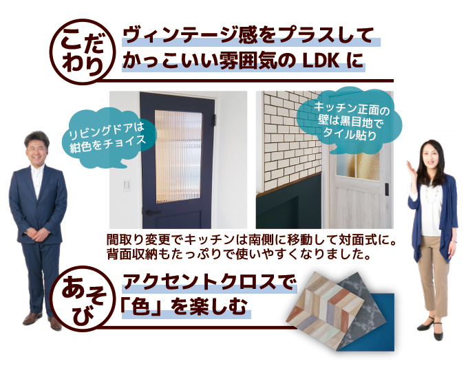 ヴィンテージ感をプラスしたかっこいいLDK(紺色のリビングドア、黒目地のタイル貼り) / さまざまなアクセントクロス(玄関、洗面、トイレ、居室など) / 水まわり設備(システムキッチン:TOTO ザ・クラッソI型 2550、バスルーム:TOTO サザナ HSシリーズ 1616サイズ、トイレ:TOTO レストパルI型、洗面:TOTO サクア)