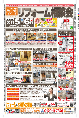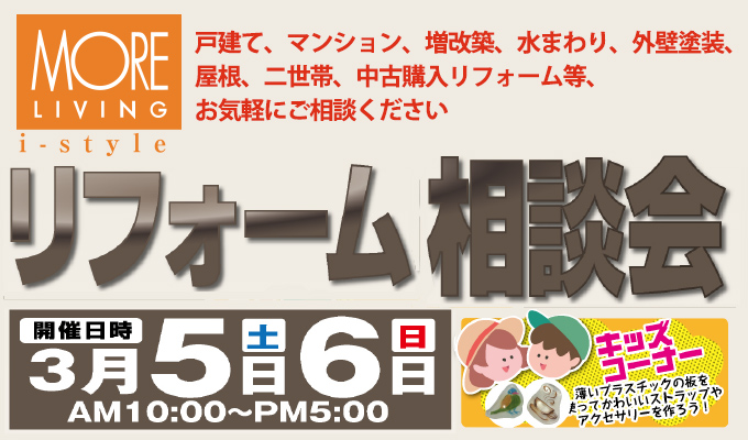 モアリビング アイ・スタイル では、3月5日(土)6日(日)の2日間2つの会場で、リフォーム相談会を開催いたします!!