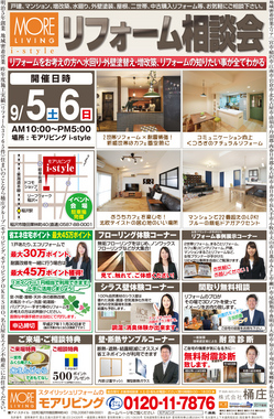 モアリビング(アイ・スタイル)では9月5日(土)、6日(日)に「リフォーム相談会」を開催いたします。