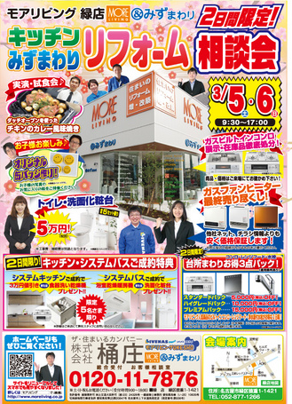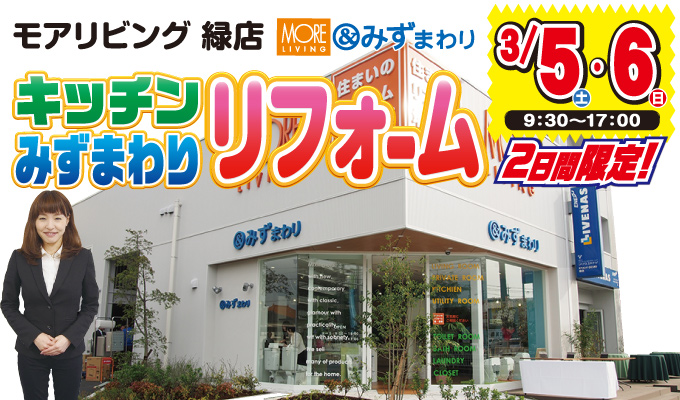 モアリビング 緑店 &みずまわり では、3月5日(土)6日(日)の2日間限定で、キッチン・水まわりリフォーム相談会を開催いたします!!