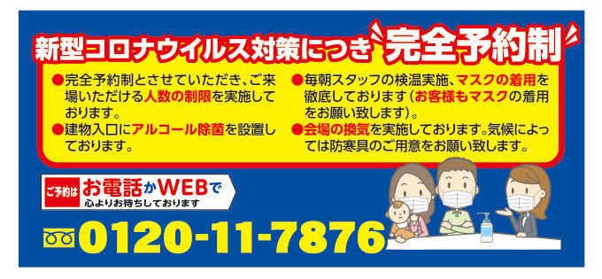 新型コロナウィルス対策につき"完全予約制"です。ご来場いただける人数の制限を実施しておりますので、どうぞご協力のほどよろしくお願いいたします。