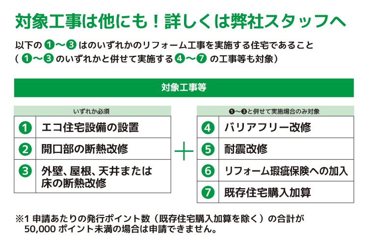 リフォーム工事の詳細は国土交通省グリーン住宅ポイント事務局ホームページでご確認いただけます。