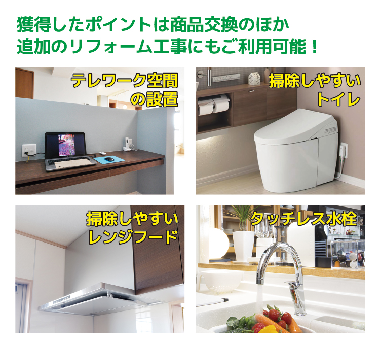 上記は追加工事の一部になります。詳細は国土交通省グリーン住宅ポイント事務局ホームページでご確認いただけます。追加工事ではなく商品との交換を希望される方はこちらより詳細をご確認いただけます。